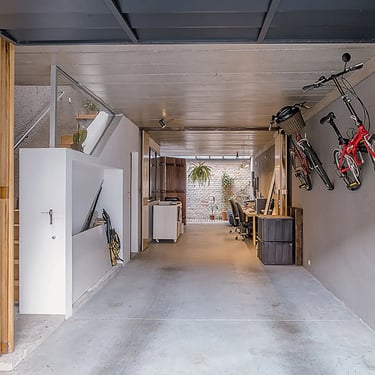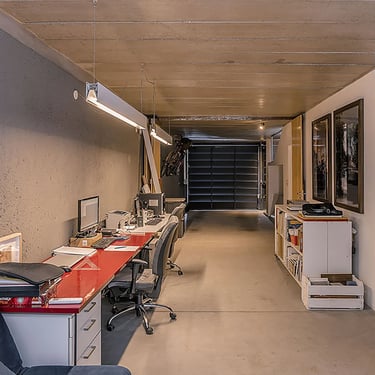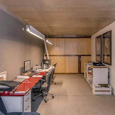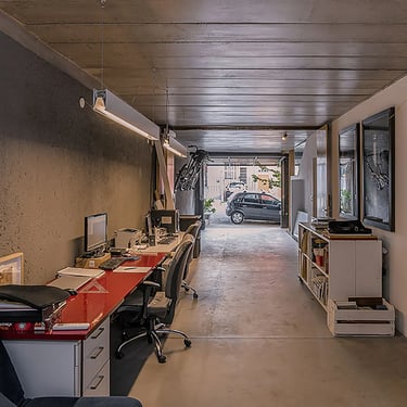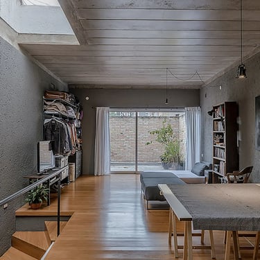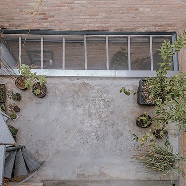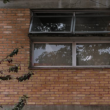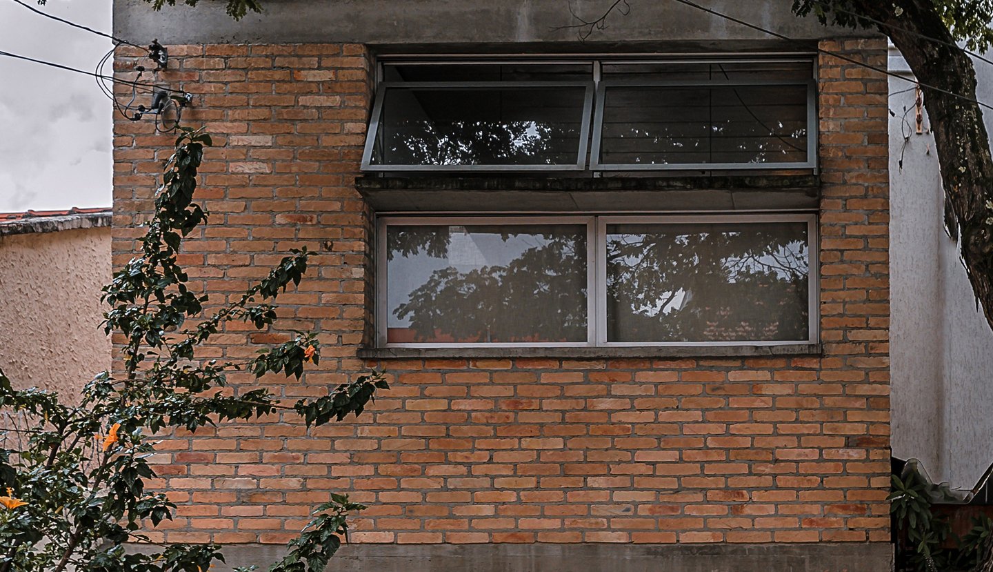 Por motivação econômica e estética, adotei sistema construtivo com lajes painel aparente, piso industrial polido em concreto no térreo e tijolos aparentes externos (uma vez que eram grandes e de ótima qualidade).