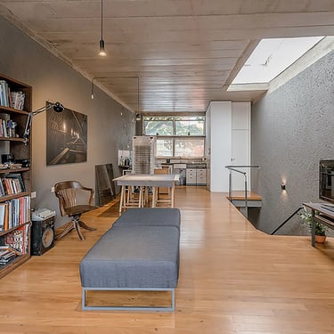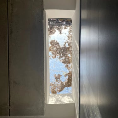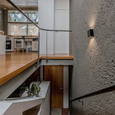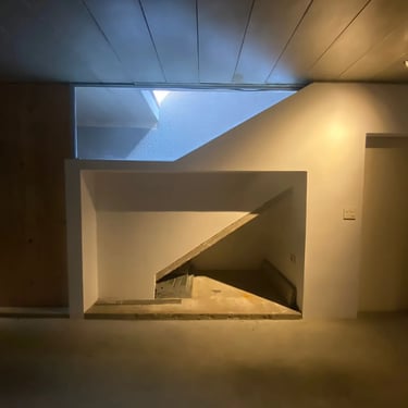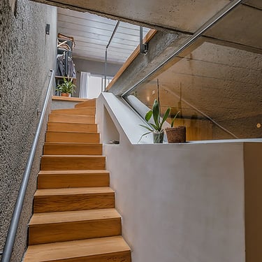 Por fim, sobre a escada uma claraboia em vidro, motorizada, que se permite abrir e ventilar toda a casa em sistema de exaustão natural do calor. Esse vão é também uma espera para futura escada de acesso ao pavimento seguinte em uma eventual ampliação.