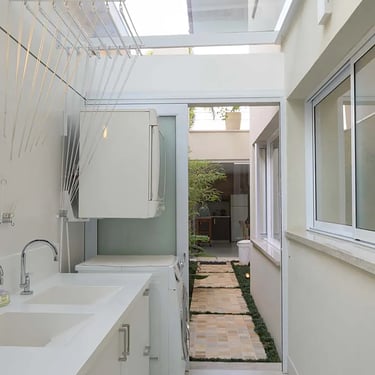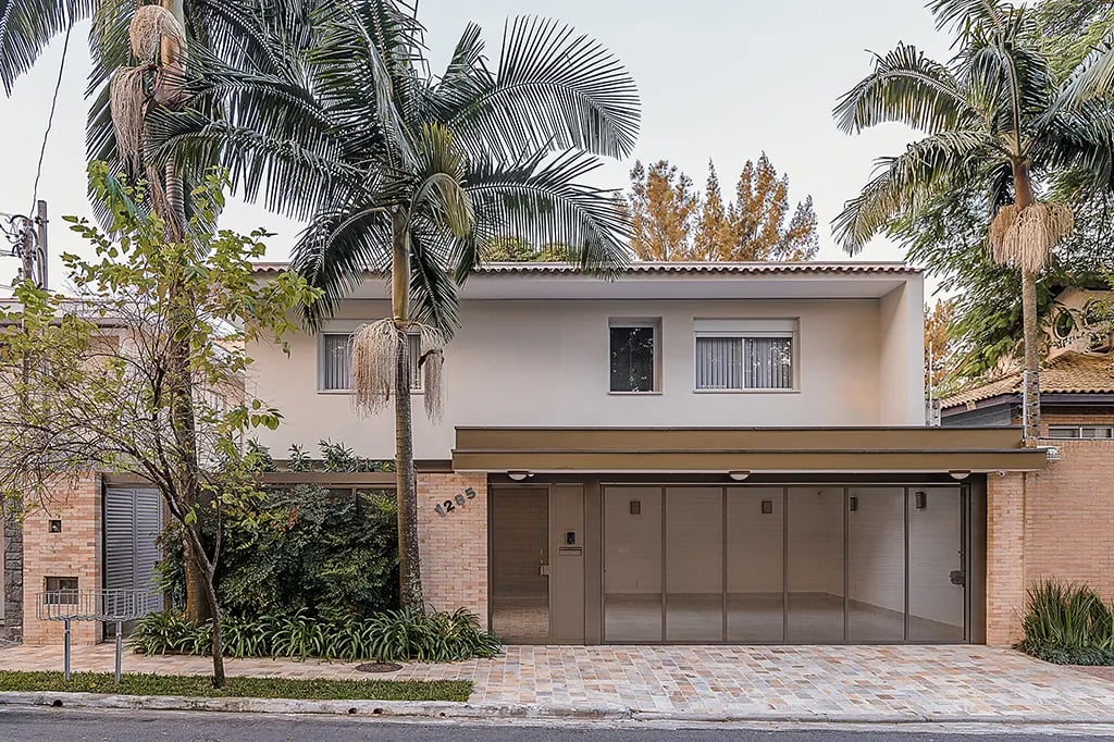 4 dormitórios com dois banheiros viraram 5 suítes; o espaço da sala ganhou um hometheater, lavanderia foi para a lateral com teto de vidro, cozinha abriu para o jardim da frente.