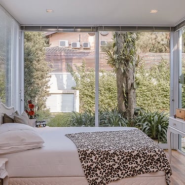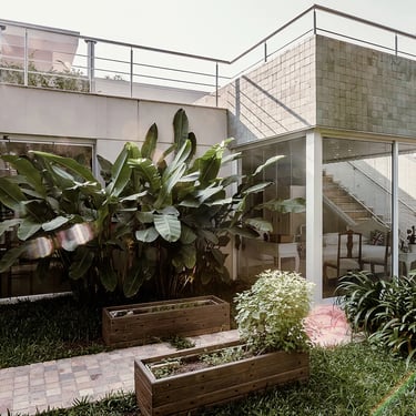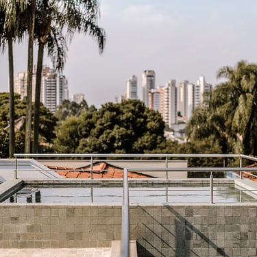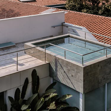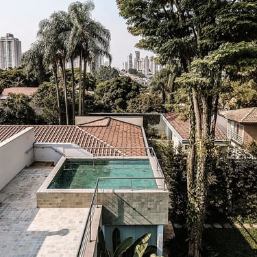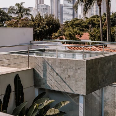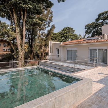 A principal mudança foi a exclusão de um pavimento da edícula, o que abriu a casa para a luz e visibilidade para o horizonte desde o pavimento superior. Nesse terraço criado, fizemos uma piscina elevada, onde bate sol, tem vista panorâmica e privacidade.
