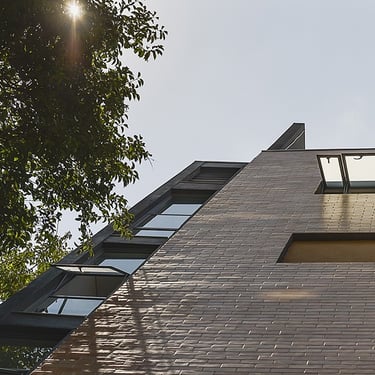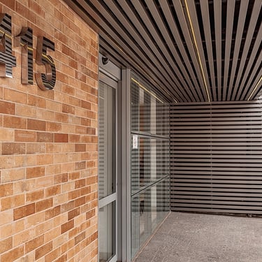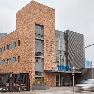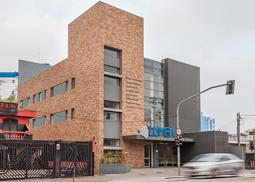 Uso de ceramica cor tijolo, com variação de tonalidade, contrastando com ripado metálico, imprime ao edificio um aspecto humanizado, trazendo mais calor humano a um espaço comumente associado à assepsia e controle.
