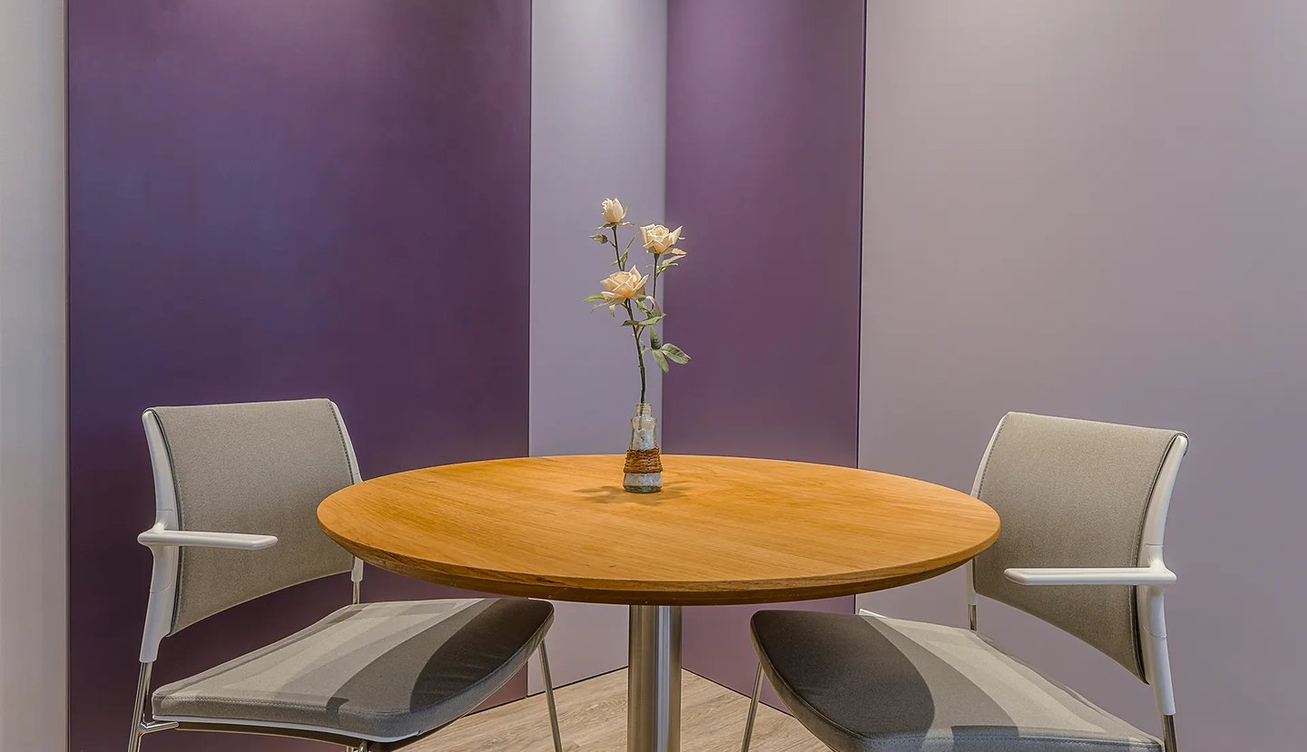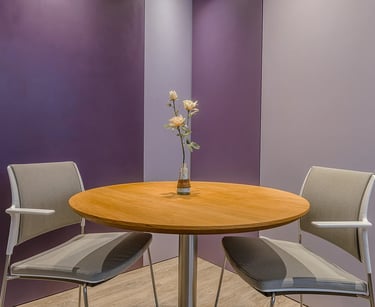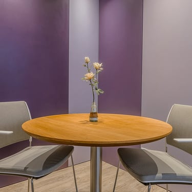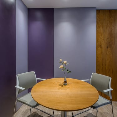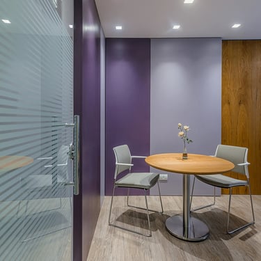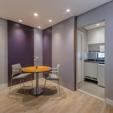 Trouxe o mesmo princípio do primeiro, nesse caso adotando tons de lilás, excluindo posto de secretária que é substituído por mesa redonda para recepção.