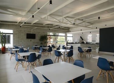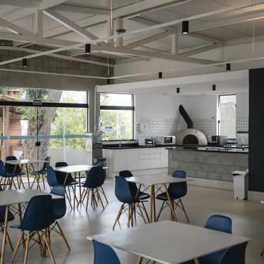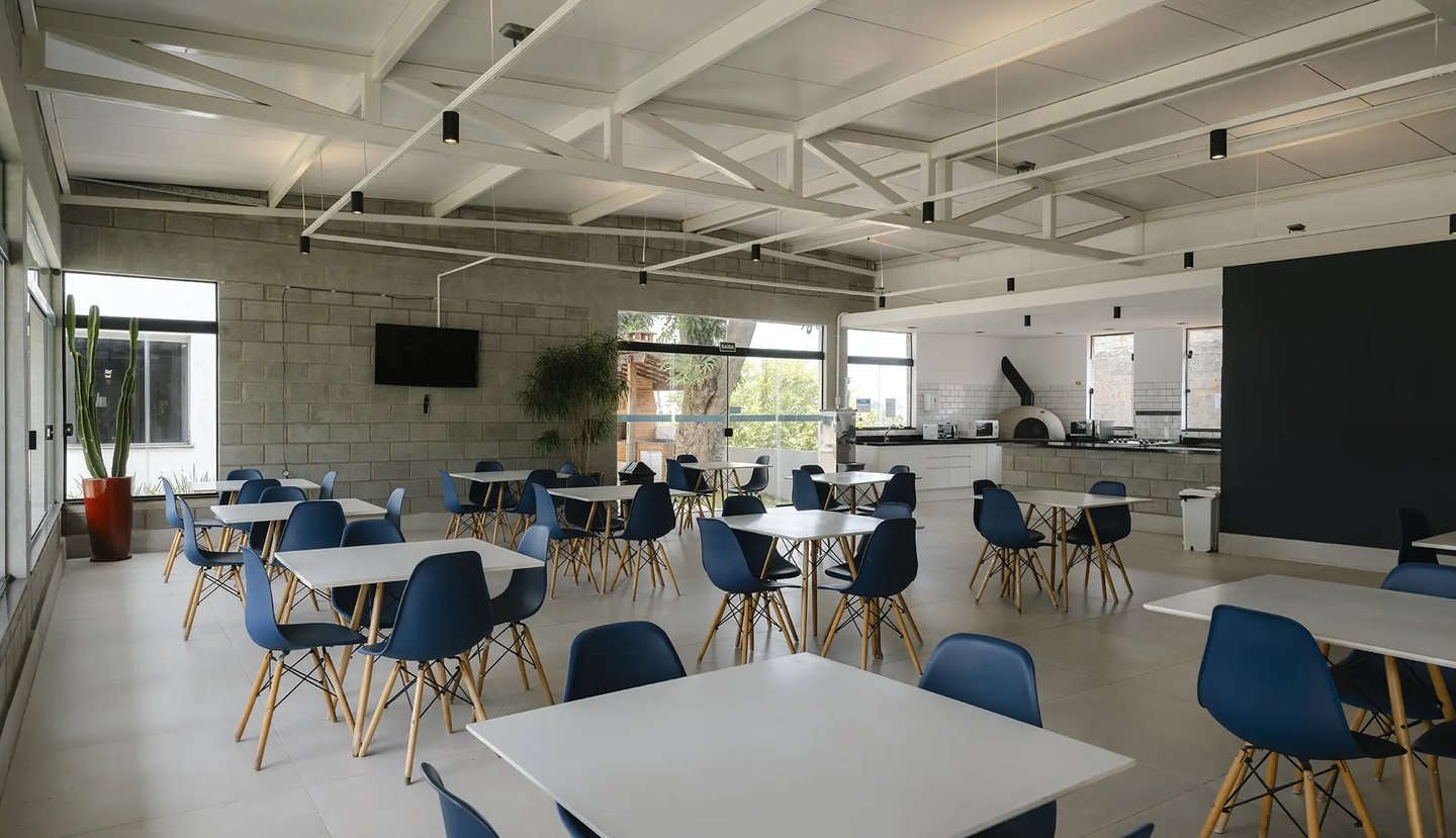 Basicamente é um espaço com copa e local para refeições e café, mas com estrutura para festas e eventos internos, com mesas espaçadas e grande transparência convidando à entrada.