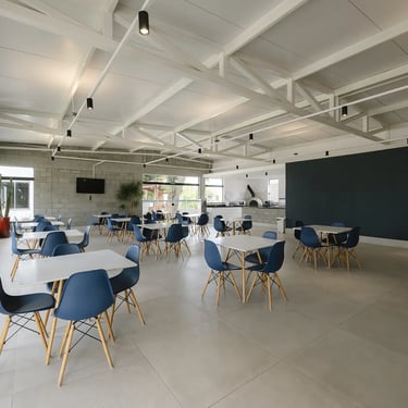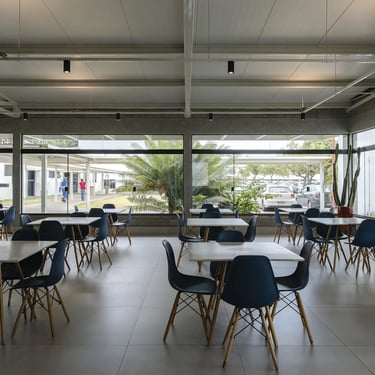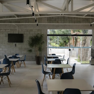 O fechamento em blocos e estrutura metálica aparentes, com cobertura em telha forro com isolamento térmico, resulta em uma construção muito enxuta e de ótimo custo benefício.