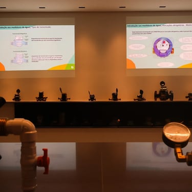 No centro do espaço criamos e produzimos um par de réplicas dos cavaletes de testes do laboratório, onde podem ser demonstrados em funcionamento hidrômetros de diferentes tecnologias, simulação de vazamentos, precisão de leitura, etc.