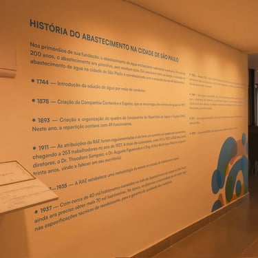A organização curatorial foi feita por mim em conjunto com a equipe interna da Sabesp organizando o conteúdo em três pilares: acervo histórico, tecnologia e educacional, sendo esse último composto por vídeos de animação em stopmotion voltados a público estudantil, onde são apresentados conceitos básicos da distribuição de água.