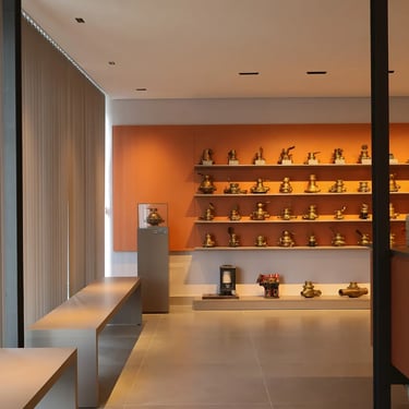 A ambientação segue a nova identidade visual da empresa, e incorpora a materialidade da cor tijolo para combinar com o latão, utilizado na fabricação da maioria das peças.