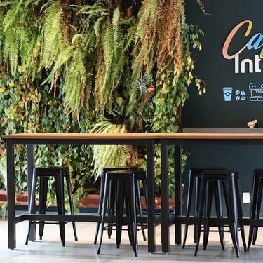 Usamos e destacamos a presença de materiais crus como o concreto aparente e piso tonalidade cimento em harmonia com os acabamentos em madeira do mobiliário. Somados as cores das pinturas e revestimentos, buscamos um resultado com força e jovialidade.